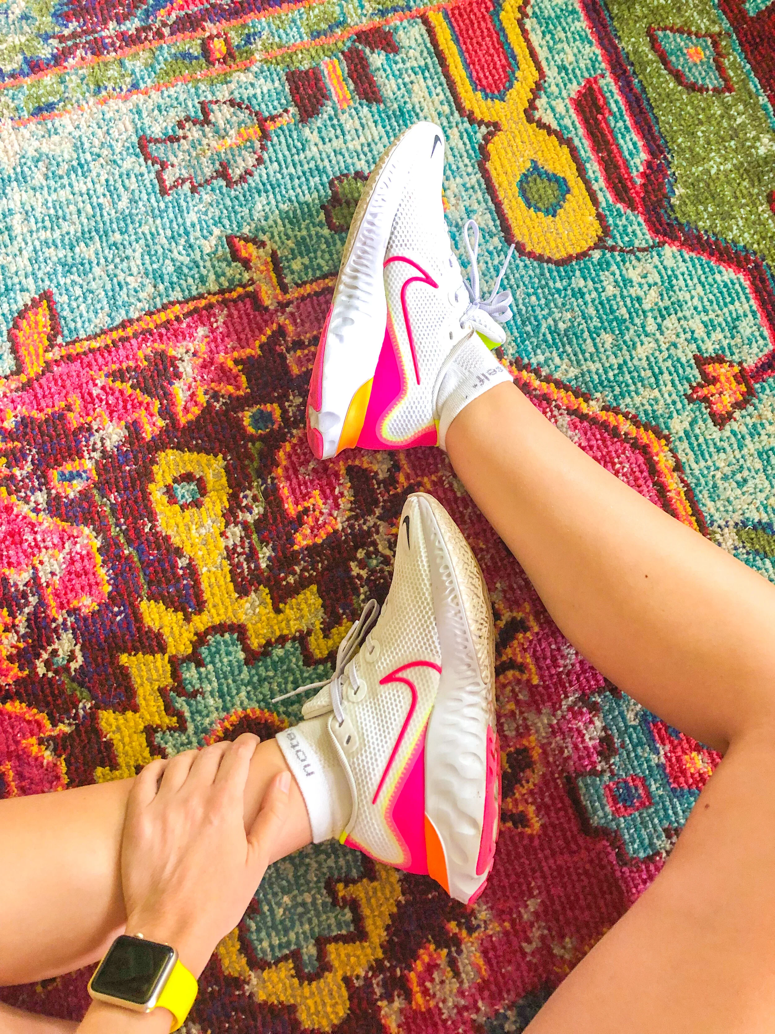 Since daily walks are keeping us sane during quarantine, I snagged a new pair of sneakers a couple of weeks ago, and they make me SO happy! They’re just the perfect clean white sneaker with a bright pop of color, which I absolutely love! They have the pink swoosh on the inner side (as shown in this super awkward photo of my legs) and the black swoosh on the outer side (as shown in the links below).