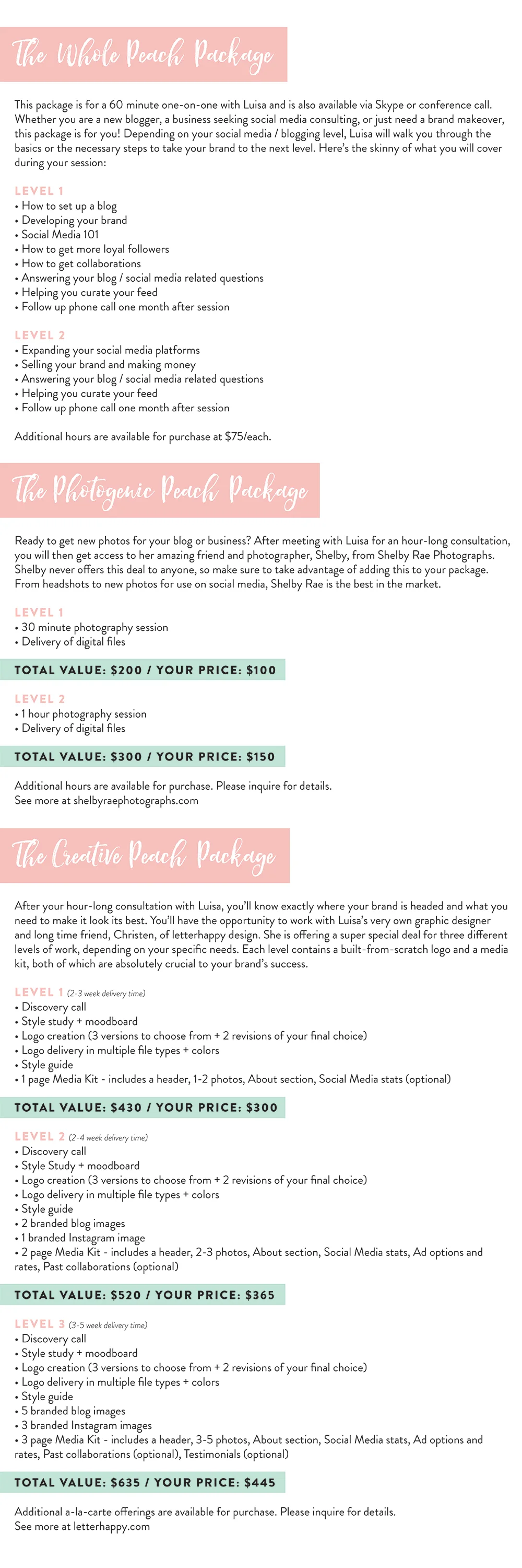 Luisa, who runs the super successful blog, Peaches to Pearls, is sitting down with you to discuss blog basics, developing your brand, social media, and so much more. After your 60 minute consultation with her (a total steal at $125!), you get access to both her photographer, Shelby, and her designer, ME! These are packages that neither of us offer as a stand-alone option, so take advantage of this bundle while you can!